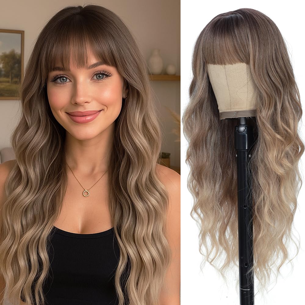 Long Blonde Wigs with Bangs 26Inch Wavy Curly Hair for Women Tangle Free Soft Natural Looking Premium Heat Resistant Protein Fiber Daily Party Use